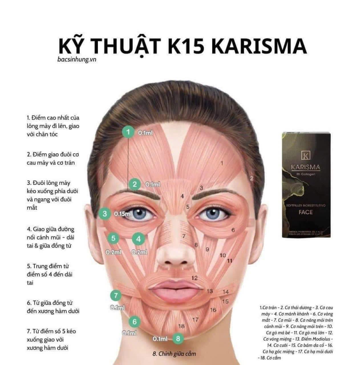 Liệu trình 3 lần, tiêm mỗi bên 7 điểm – cằm 1 điểm là tổng khuôn mặt 15 điểm. Được dùng cho vùng da mặt, cổ, khe ngực, tay.